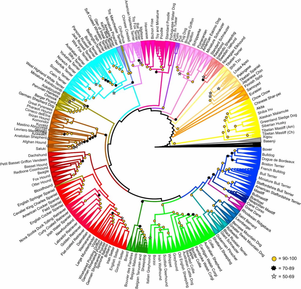Roduista 146 (91 %) muodosti sukupuuhun selkeät rotukohtaiset ryhmänsä (Kuva 1). Yhdeksän rotua (belgianpaimenkoirat tervueren ja groenendael, cane corso, bullterrieri, kääpiöbullterrieri, rottaterrieri, amerikankarvatonterrieri, lhasa apso ja saluki) muodostivat myös rotukohtaisia ryhmiään, mutta hieman pienemmällä varmuudella.