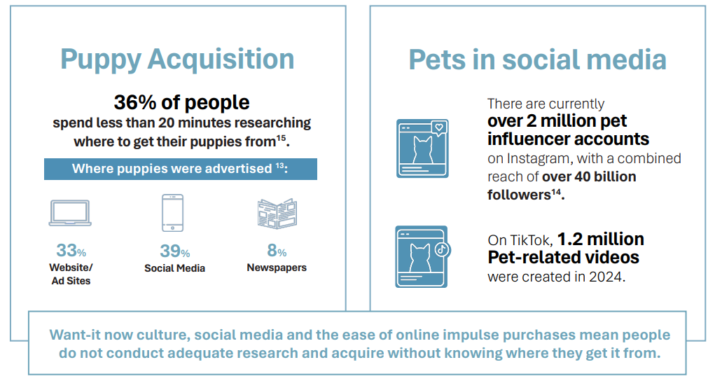 Lähes puolet verkosta ostetuista pennuista vieroitetaan ennen kahdeksan viikon ikää ilman sosiaalistamista tai terveystarkastuksia. Kolmasosa sairastuu pian uuteen kotiinsa muutettuaan. Neljäsosa sosiaalisen median kautta hankituista lemmikeistä kuolee ennen viidettä ikävuottaan.